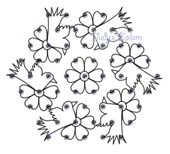 a pattern, in which a stroke (kambi, sikku in Tamil) runs once around each dot (pulli), and goes to the beginning point (endless/cycle), as a mostly geometrical figure. The stroke has a knot (sikku) structure and hence is called Kambi or Sikku Kolam.